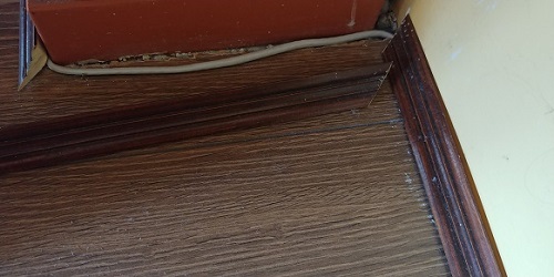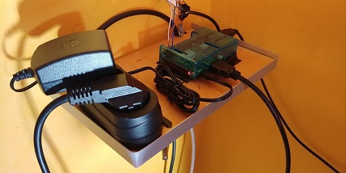 Najbardziej czasochłonną czynnością było poprowadzenie kabla przez kolejne pomieszczenia. Było to spowodowane tym, że skrętka jest dosyć gruba (estetyka wymagała jednak całkowitego ukrycia tego kabla) oraz tym, że kabel będzie obejmował pomieszczenia leżące zarówno na parterze, jak i na piętrze. Stwierdziłem, że najrozsądniejsze będzie poprowadzenie tego kabla pod listewkami, a jako przejście pomiędzy piętrami wykorzystam instalację wodną (kabel puściłem równolegle przy rurach). Początkowo chciałem zasilać malinkę z powerbanku (który mógłby służyć jako awaryjne źródło zasilania), jednakże to rozwiązanie miało zbyt dużo wad. Swoje raspberry wykorzystuję również do innych celów, a pod obciążeniem powerbank okazał się zbyt słabym źródłem zasilania. Ponadto, powerbank podpięty na stałe pod ładowarkę bardzo szybko uległby zużyciu. Ostatecznie zdecydowałem się na użycie dedykowanego zasilacza podłączonego pod UPS, który służy mi głównie jako zasilanie awarjne PC-ta. Całość zamontowałem na małej półce wykonanej z drewna oraz kątownika. Następnym krokiem była konfiguracja malinki oraz wstępne podłączenie czujników.